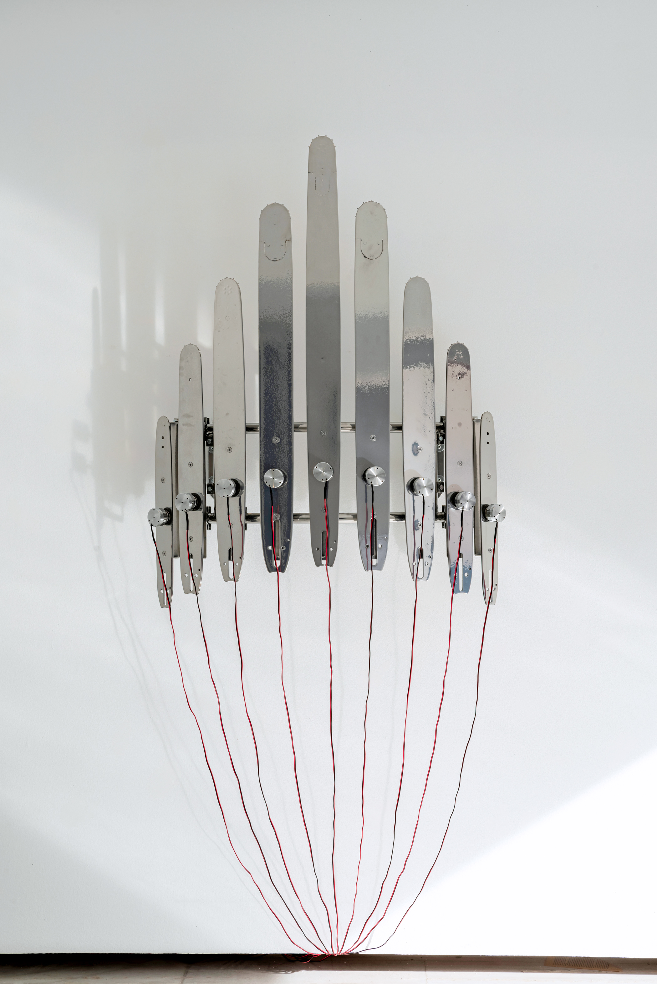 The installation deploys a composition based on field recordings from burned areas after forest fires into chainsaw components, surfacing overtones through their vibration and resonance. Intersecting acoustic geography and instrument crafting, the piece alludes to the tools of action used by the Diseucalyptising Brigades, a cross-border civil movement of environmental resistance reclaiming land from the invasive species, highlighting the ongoing wildfire epidemic as an echoing legacy of the Iberian dictatorships.