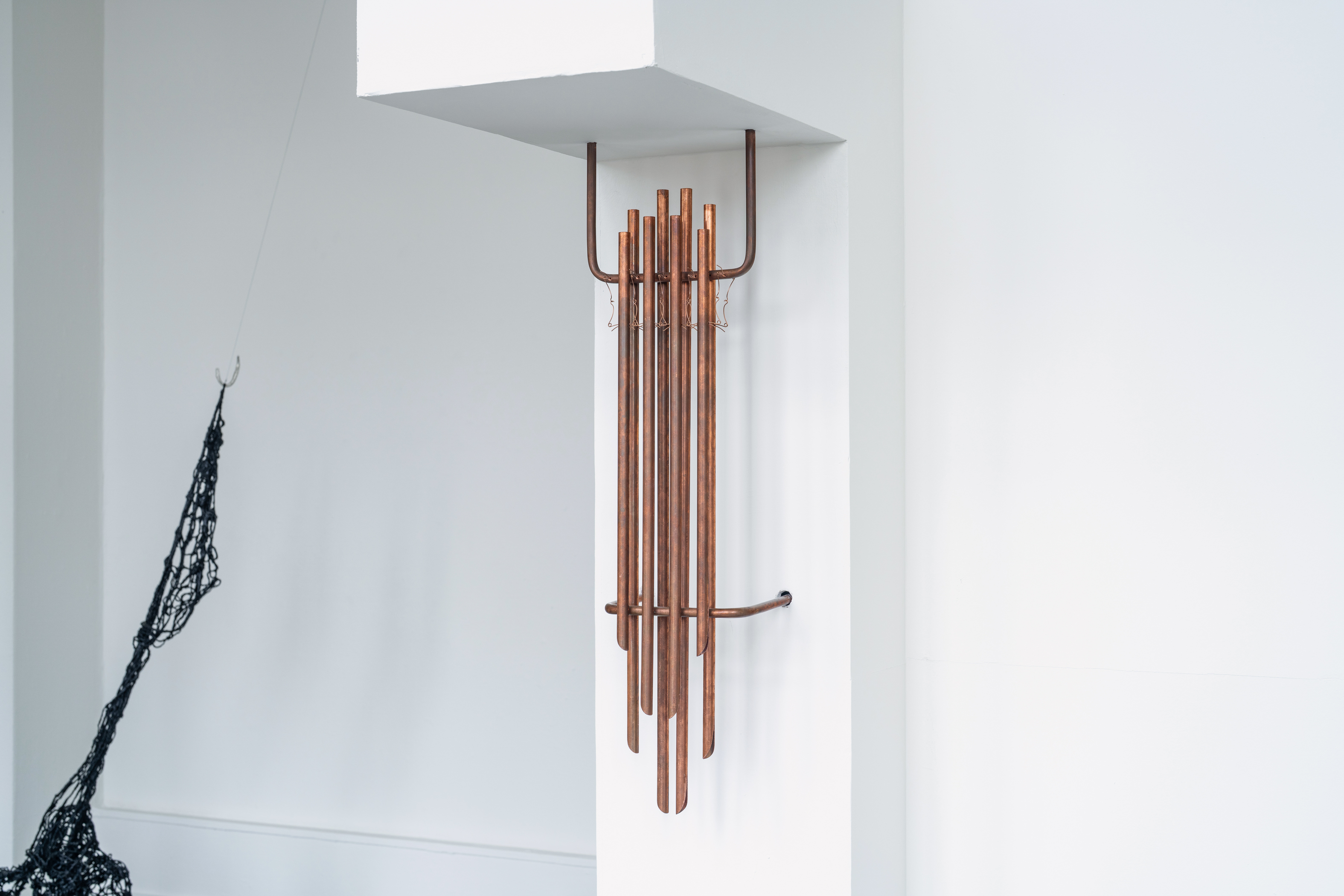 In Harbinger (Gust), discarded wind recordings are converted into tremors that animate copper water pipes as tubular bells. This chance-based composition allows the wind of an exterior to resonate within an interior, reversing the bad omen tied to a wind chime falling silent when the air agitates.