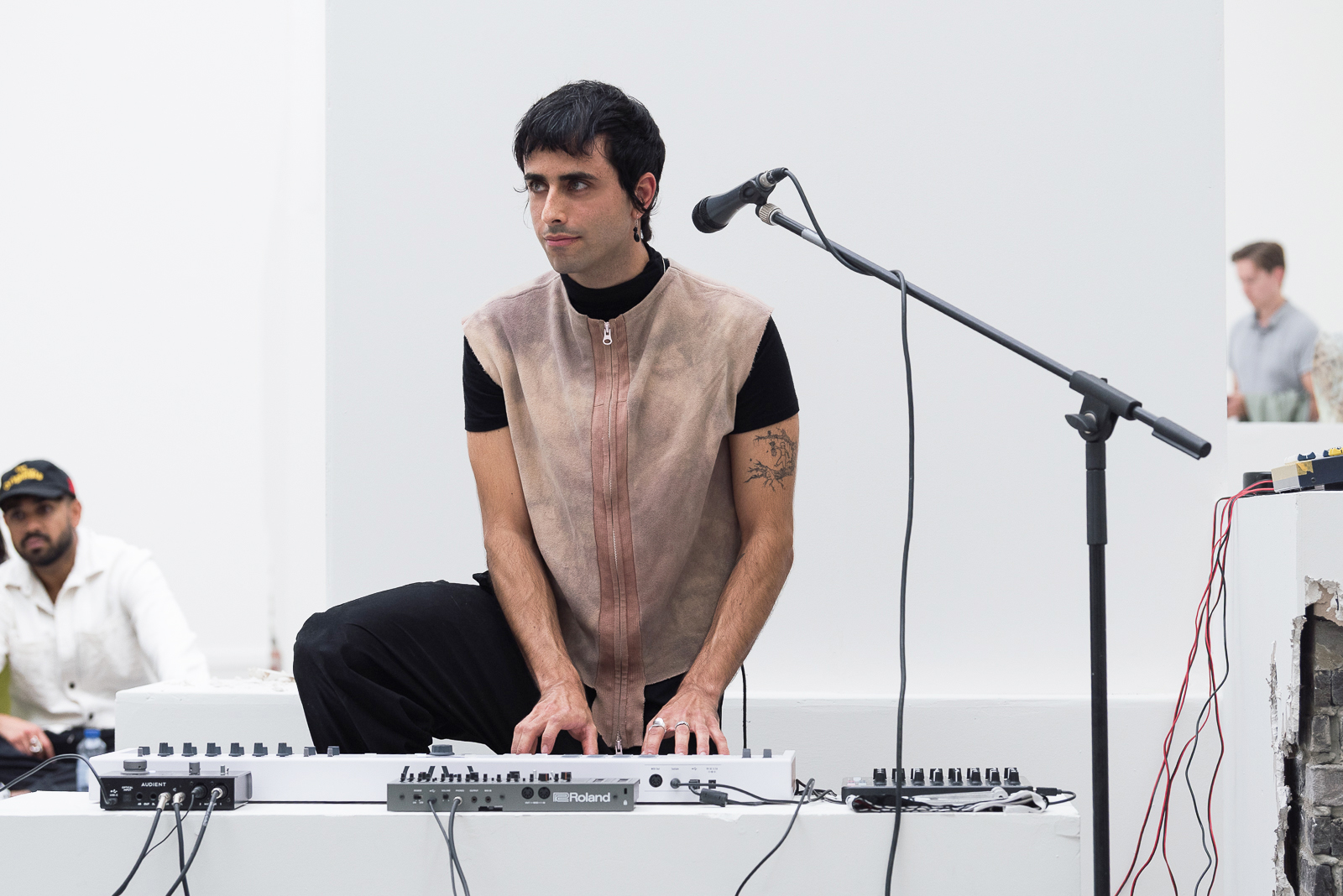 An act of animating the scenographic exhibition walls as resonant architectures, transforming the space into an expanded sonic field. Engaging in a practice of lowercase music, where almost imperceptible sounds are amplified to extreme levels, the piece weaves vibration into sculptural sonic textures; a shared improvisational language unfolds through the layering of field recordings, vocalisations, intervened instruments, and amplified objects.