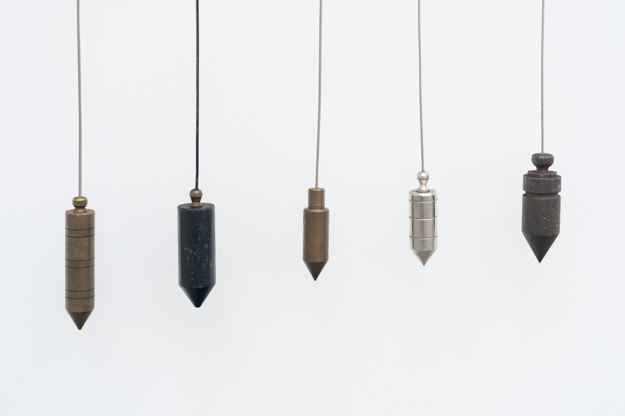 2025In Harbinger (Spectre), walls tremble with low frequencies that cause plumb bobs suspended from piano and harp strings to subtly oscillate. Used in construction to ensure the straightness of architectural elements, movement frustrates their purpose; measuring devices when still, and divinatory pendulums when in motion. Across the series, inaudible vibrations engage with scenographic elements to give shape to presences that emerge at the threshold of perception.
