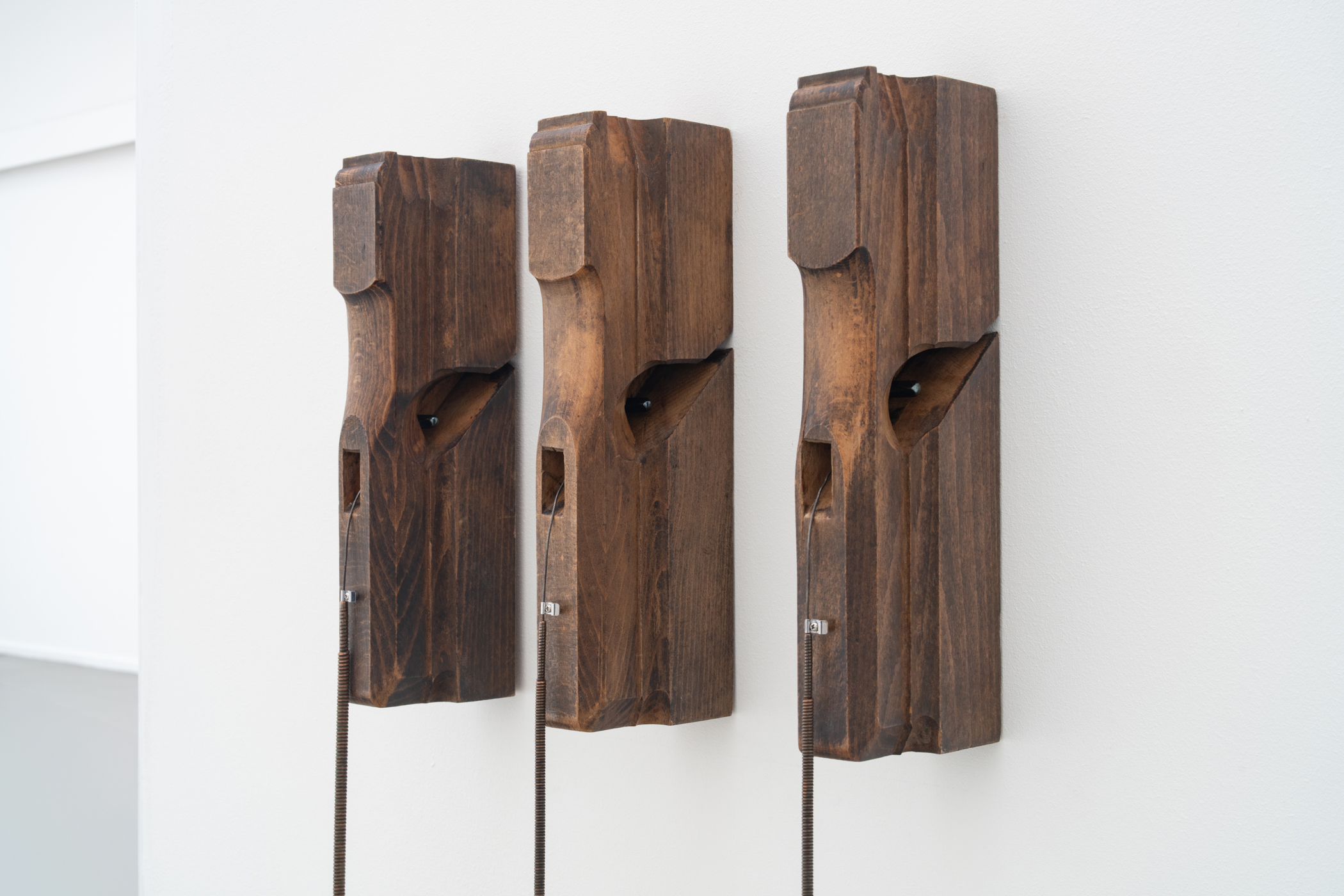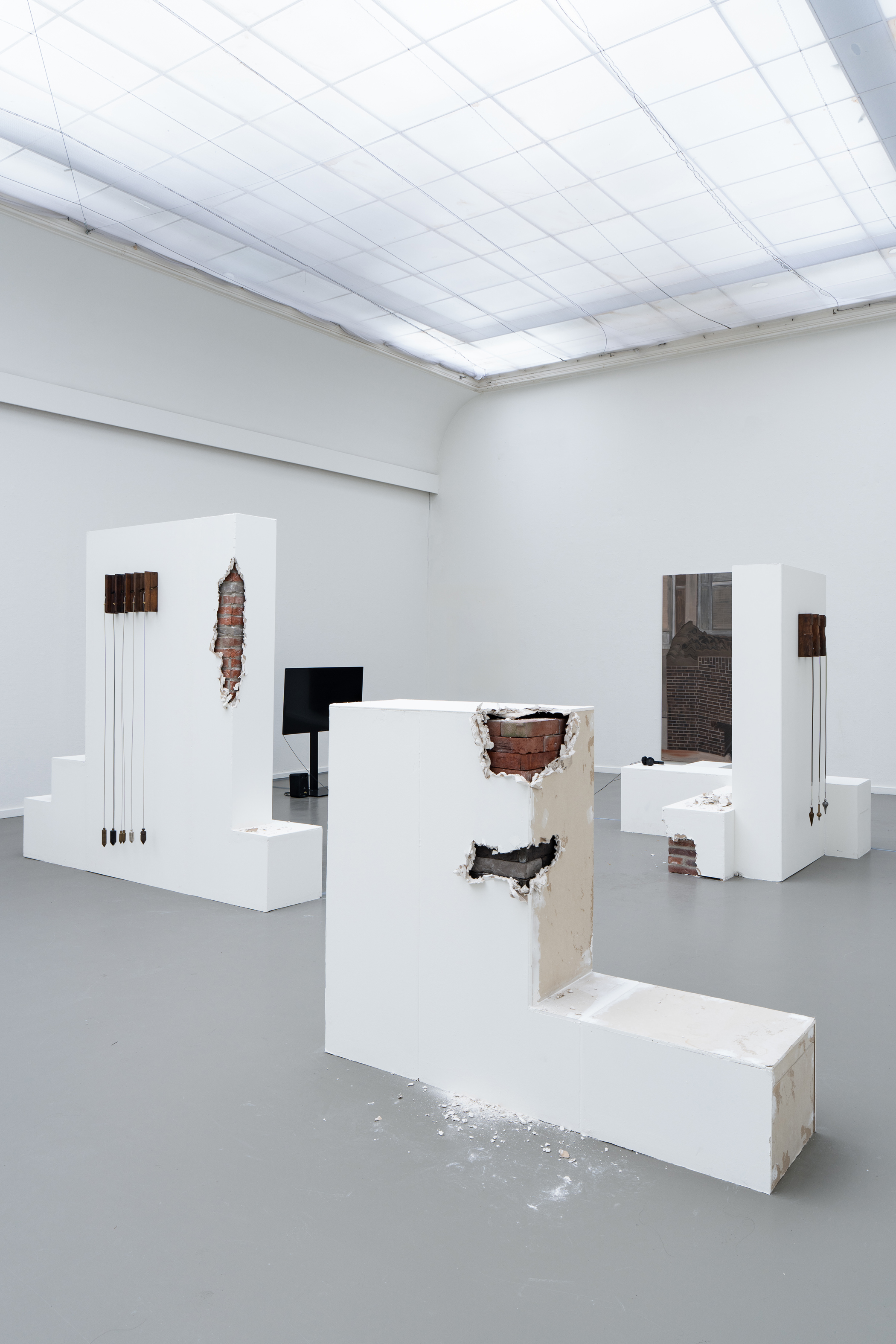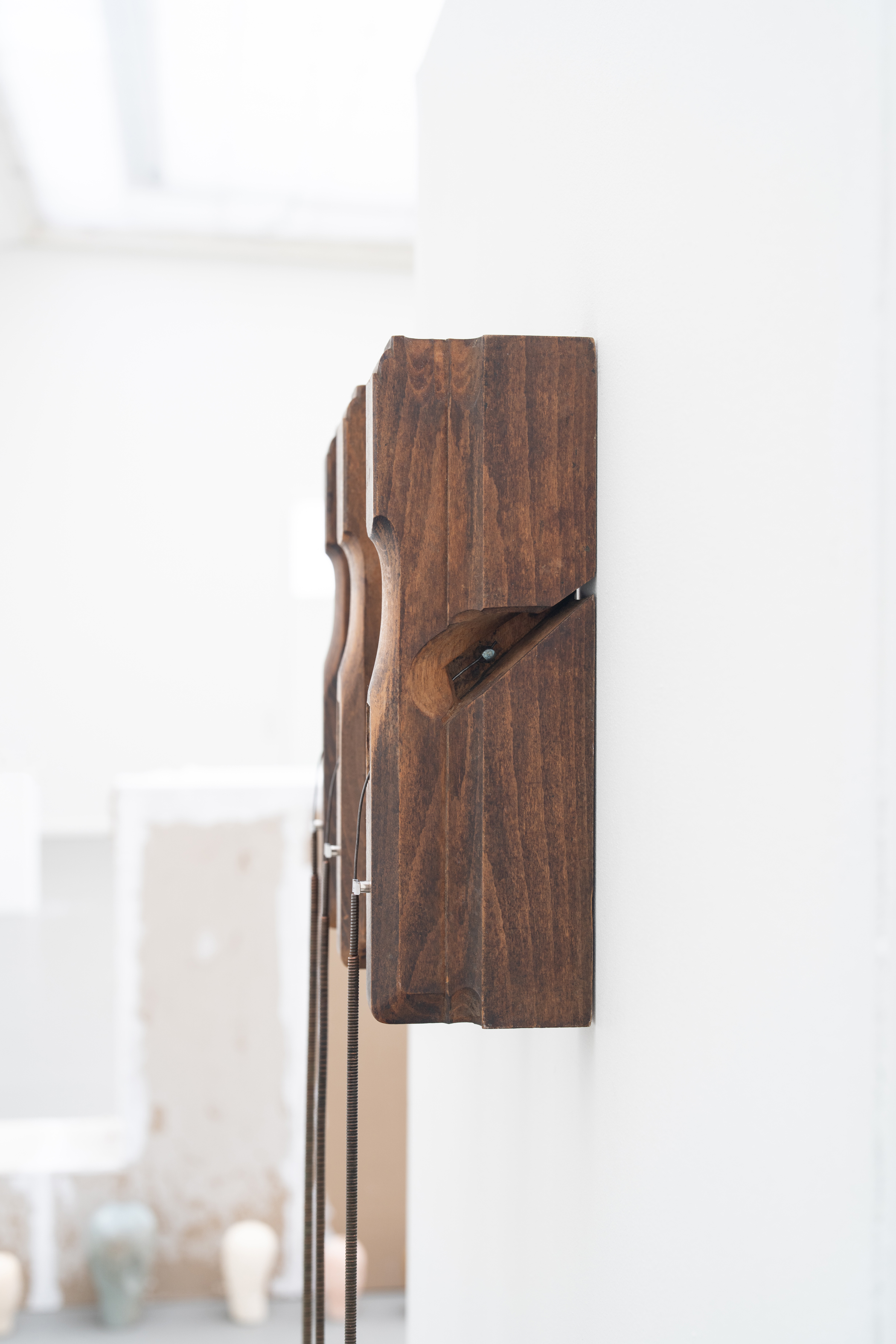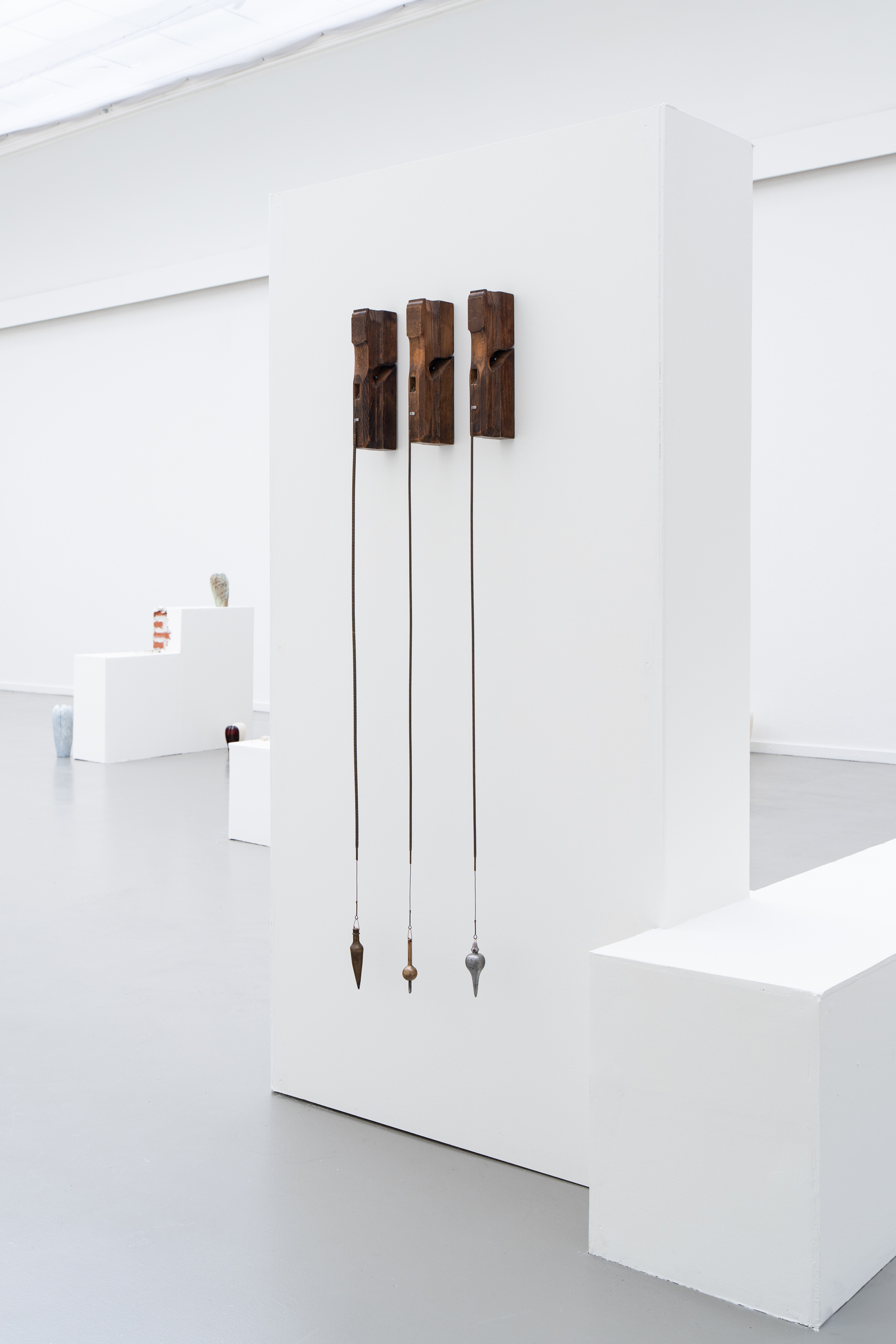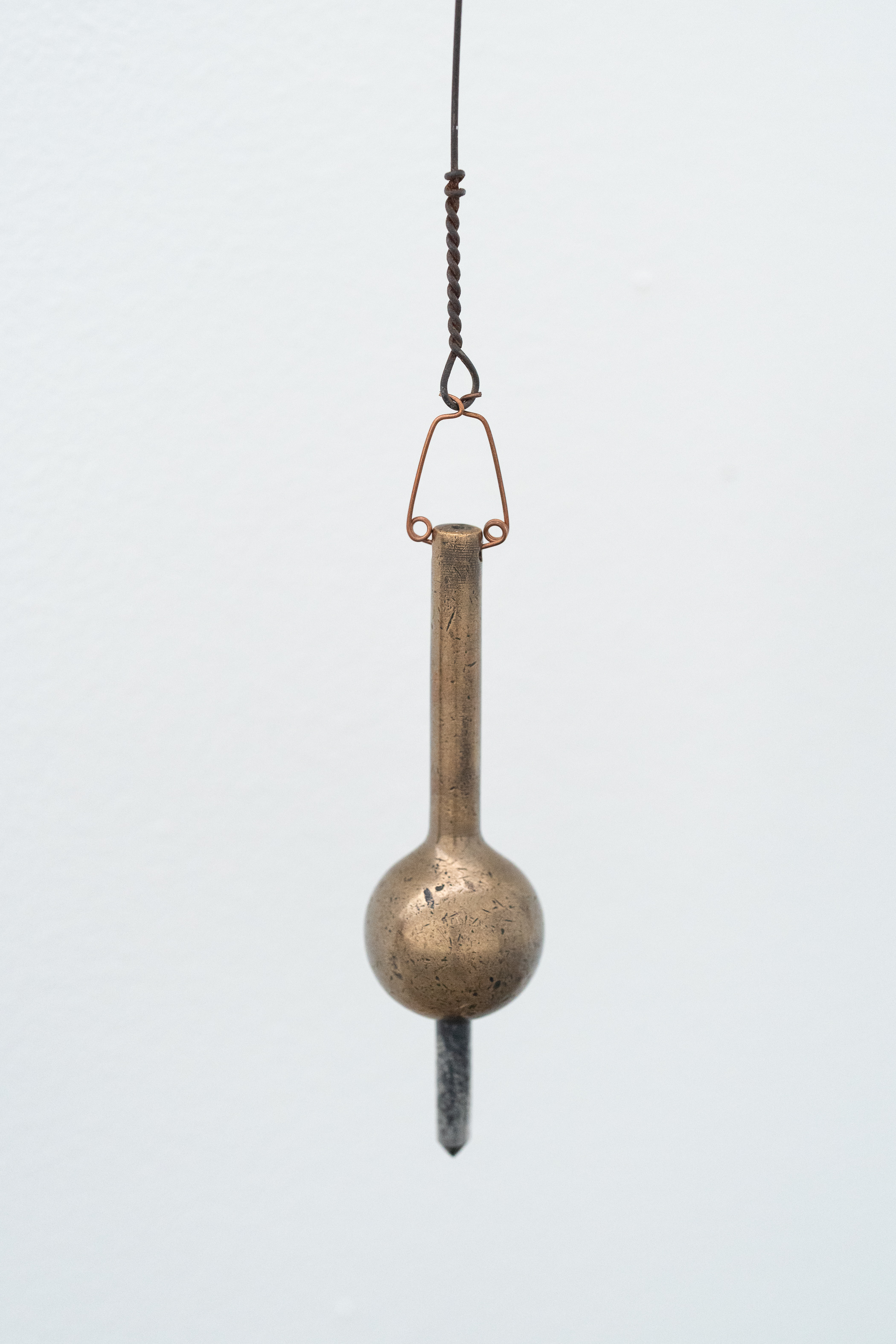2025In Harbinger (Spectre), walls tremble with low frequencies that cause plumb bobs suspended from piano and harp strings to oscillate subtly. Used in construction to ensure the straightness of architectural elements, movement frustrates their purpose; measuring devices when still, and divinatory pendulums when in motion. Across the series, inaudible vibrations engage with scenographic elements to give shape to presences that emerge at the threshold of perception.